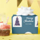 Personalized Name Teal Chequered Christmas Tree Pattern Wrapping Paper. Shown on a dark teal background with white text. The Christmas tree is in a fun retro chequerboard pattern in blue, pinks, purple, and teal on a white arch. Personalize with a name. © Kimbellished, LLC