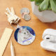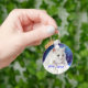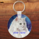 This beautiful personalised custom keychain has a fine art cat portrait by international artist Kitty Harvill. It has a white, long-haired Persian cat with green eyes, looking to the side. The background is a colourful, vibrant blue.