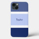 You'll love this stylish nautical hued cell phone case with a blue and white stripe pattern. Multiple shades of large blue stripes plus small white stripes. Personalized with your name printed in a blue text.
