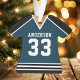 Celebrate your hockey star with this personalized navy and black hockey jersey ornament. Perfect for commemorating a special season, player, or team. Customize it with a name and number to create a unique keepsake.