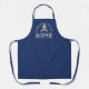 A personalized typographic apron in navy blue, with vintage flourished typography with crossed shafts of wheat above. A great gift for an avid baker or cook.