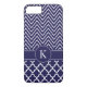 Cute Modern Girly Trendy Chic Stylish Case Design with Chevron Stripes Zigzag Pattern and Modern Geometric Quatrefoil or Moroccan pattern with Custom Personalized Monogram Initial in a Circle Frame Border. Navy Blue and white colours. Choose your phone make and model. Personalize your gift by adding your own initials. Choose your own font and colours to make it your own. This will make a great gift for Birthday, Christmas, College, School, women, girls, teenagers.