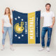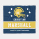 Personalized football themed fleece blanket for players when they're not scoring touchdowns on the field, and for their parents to support their kids and stay warm at chilly games! Makes a unique team gift. Design features a football helmet customized with the player's uniform number, custom text for the player's first and last name, and modern text for the team name. Stylish and modern design features sporty varsity jersey lettering and simple horizontal stripes with star accents. The colour scheme of navy blue, maize yellow, and white can be modified to coordinate with your team colours.