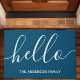 Welcome guests with a warm and friendly greeting using this personalized doormat. Featuring a modern script "hello" in white on a stylish navy blue background, this customizable doormat adds a touch of charm to any entryway.