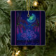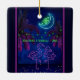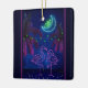 This tropical beach Christmas tree ornament features two Pink Neon Flamingos in Love under a Neon Moon. They are surrounded by palm trees decorated with green neon string lights. The back can be personalized with names, a year or any text that you wish to add. -