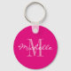 Neon pink and white name monogram round button keychain. Classy script typography and custom background colour. Elegant key chain design for women and girls. Monogrammed with your own unique name initial letter. Cute wedding party favour or Birthday gift idea. Also nice for bridal shower, reunion, bachelorette, girls weekend etc.