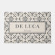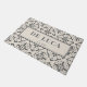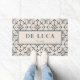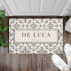 An elegant personalized newlywed couple doormat featuring a pretty diamond shaped stylized repeated floral pattern in grey and cream hues. Add character to your new home together with your name and date established.