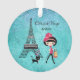Personalized oh la la chic Paris girl and cat Christmas ornament with the Eiffel tower and string lights on a blue damask background. Some graphics by Origins Digital Curio at www.etsy.com/shop/OriginsDigitalCurio.