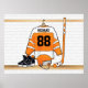 An ideal gift for the ice hockey fan, ice hockey player or ice hockey coach, this design features a personalized ice hockey jersey in orange and white hanging in a sports locker room with a helmet, ice skates and an ice hockey stick. The jersey can be fully customized with the number and name of your choice to create a great personalized ice hockey gift.