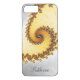 This personalized iPhone case features colourful spiral fractal in yellow, orange and light grey. Customizable name in a grey script font at the bottom.