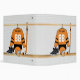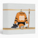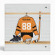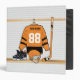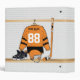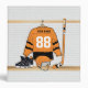 A personalized ice hockey jersey in blue and white hanging in a sports locker room with a helmet, ice skates and an ice hockey stick. The jersey can be fully customized with the number and name of your choice to make a great gift for the ice hockey fan, ice hockey player or ice hockey coach.