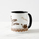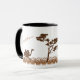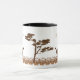 This personalized mug features two dark brown ostrich silhouettes facing a silhouette of an Acacia tree in the centre of the mug. A grasslands style strip of brown and tan blades of grass border the bottom of the mug. Above each animal, there is a template area for you to add your name or other custom text on either side of the mug.