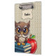 This clipboard features a golden pattern background, adorned with a book owl and apple illustration, perfect for back to school. With a dedicated space for your kid's name, this is truly a one of a kind school supply they will use for years to come.
