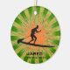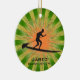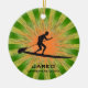 Paddleboarding Personalized Ornament Christmas 20XX. An paddleboarder poses on a board against a green and orange starburst background. All text customizable, front and back!