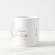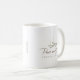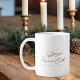 Personalized Peace on Earth Christmas Gift Coffee Mug. Shown in green, brown, and tan on a white background but all colours are editable. Elegant handwritten script with hand-drawn simple evergreen branches and candles. Personalize the template to add a name or custom vertical text to the side of the mug. © Kimbellished, LLC