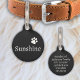 Simple design in white and black with your pet's name and address, your phone number or text. And a matching paw print.
