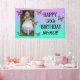 Happy Birthday Banner with your own custom photo, name and age on it. Cute for kid's birthday! For boy or girl. Purple and teal with pretty butterflies. Cute for any girl's birthday party.
