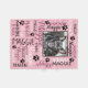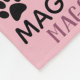 Pink Personalized blanket for your dog. Customizable with your dog or cat photo image with your dog or cat's name. When you change the name Maggie to your own pet's name it will change all the typographical names at the same time. Word cloud art typography. Different font type and styles in purple, black and white with black paw prints.
