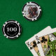 Personalized poker game chips with a custom photo and your own text (family name, established year, etc). This design in black includes the number 100 but it can be edited with any value amount.