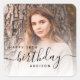 Modern birthday party stickers featuring a custom photo. Easily replace the sample image with a photo of the guest of honour. The word "birthday" appears in elegant black handwriting script. Personalize the text with the name and birthday year in black sans serif font. A white gradient overlay helps make the text pop.