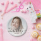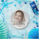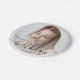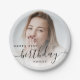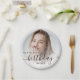 Modern birthday party paper plates featuring a custom photo. Easily replace the sample image with a photo of the guest of honour. The word "birthday" appears in elegant black handwriting script. Personalize the text with the name and birthday year in black sans serif font. A white gradient overlay helps make the text pop.