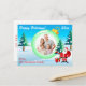 This fun personalized post card would be an economical way to send Christmas happy holidays greetings to all your family and friends. Customize the text to say what you want and upload a square shaped digital photo into the glass look ornament. The festive look is complete with a snow covered background scene, evergreen trees laden with snow, Santa gesturing to the family photo with a bag of gifts on his shoulder, and there's even a fun cartoon reindeer on the back, along with blue snowflakes and green stitching. If you have any questions, or need any changes, email niteowlstudio@gmail.com.