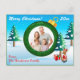 This fun personalized post card would be an economical way to send Christmas holiday greetings to all your family and friends. Customize the text to say what you want and upload a square shaped digital photo into the green glass look ornament. The festive look is complete with a snow covered background scene, evergreen trees laden with snow, a reindeer in a Santa suit, a wrapped gift, and there's even a cartoon snowman holding a heart on the back, along with red snowflakes and green stitching. If you have any questions, or need any changes, email niteowlstudio@gmail.com.