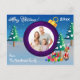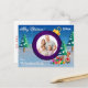 This fun personalized post card would be an economical way to send Christmas holiday greetings to all your family and friends. Customize the text to say what you want and upload a square shaped digital photo into the purple glass look ornament. The festive look is complete with a snow covered starry night time background scene, evergreen trees laden with snow, a reindeer in a Santa cap with wrapped gifts, and there's even a cartoon penguin on the back, along with red snowflakes and green stitching. If you have any questions, or need any changes, email niteowlstudio@gmail.com.