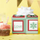 Add four medium-large personalized custom digital photos to this festive classy square jumbled frame shape picture frame wrapping paper that says "love and joy" with light and dark shades of grey, red and green.