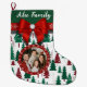 Add a personal touch to your holiday décor with this custom Christmas stocking, perfect for showcasing your family's most cherished moments, your loved one picture, or even your lovely pet. This beautifully designed stocking features a festive green and red theme with classic Christmas trees as the background. A large, eye-catching red bow with a sparkling jewel accent sits at the top, creating a cheerful and elegant look. Below the bow, there's space for a personalized name in stylish script font.