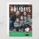 This festive, customizable photo card is a perfect way to send season's greetings. It features a large full-bleed photo template and the phrase "HAPPY HOLIDAYS" in bold white lettering across the top. The card's bottom section has a vibrant green banner where a classic Peanuts graphic shows Snoopy dressed in a full Santa Claus suit. The banner includes customizable fields for the Family Name, individual signatures, and the Year. This design offers a fun, non-denominational greeting combined with a classic Snoopy Christmas look and a modern photo layout.
