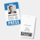 Personalize these vertical press pass badges with an employee photo and name, along with three custom text fields for media outlet name, title or role, and ID number or valid dates, along with the media outlet company logo. PRESS appears along the bottom in bold white lettering for easy identification. Customize with a barcode on the back if needed, along with return information or other details.