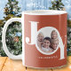 This modern Christmas Holiday Photo Mug is decorated with the word JOY in white on a rust background.