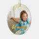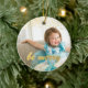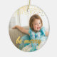 Personalized photo holiday ornament with gold confetti and gold callygraphic "Be merry". Easy to customise with your own names and photography.