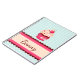 Notebook with pink cupcake and cherry on mint blue striped background.