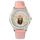 Cute floral kid's stainless steel pink leather strap watch with a red panda / lesser panda mom holding its baby. Personalize with your name. You can find matching red panda products at my store.