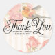 Beautiful pink roses look fabulous on soft pink and cream vertical stripes. A golden bird explores them. Thank You is written in a large black ornate script. Your names and wedding date, graduation date or anniversary date is below.