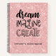 This personalized girly 8.5 x 11 sketchbook has black text on a pink faux glitter background. The words, "DREAM,IMAGINE,CREATE" in a hand drawn font personalized with your name below. Customize the sketchbook with the name of your choice to make someone feel extra special. Makes a fun gift for birthdays or for Christmas. Comes in a variety of colours. Designed for you by Blackberry Boulevard.