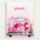 A soft pink watercolor planner cover featuring a cute vintage truck filled with flowers, gifts, and hearts.