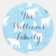 Personalized classic round stickers featuring cute polar bears with falling snowflakes on an ice blue background with the family name in a bluey-grey script font. Perfect for envelope seals and gift labels. Designed by Thisisnotme©