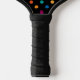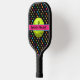 You'll stand out on the Pickleball court with this custom-designed pickleball paddle with this bright;y coloured polka dot pattern on a black background with a pink and blue trimmed band across the centre that has customizable wording on both sides. The front says, "Let's Get Pickled" and the back is personalized with your name. There is an image of a neon green pickleball behind the pink band on both sides. You can also change the background colour to any colour you want by using the EDIT design feature. Email niteowlstudio@gmail.com with any request for changes.