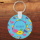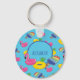 Create a unique personalized gift that's perfect for your favorite swimmer. This keychain features a pattern of brightly colored pool floats or pool tubes in the shape of a flamingo, a pineapple and a popsicle against a bright blue background. Use the template field to easily add your name to this pool party themed keychain.