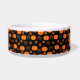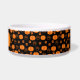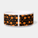 This custom dog bowl features a cute scattered pumpkins and paws pattern with orange pumpkins and paws on a black background.