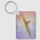 A personalized keychain featuring a barn owl with a textured rainbow background. Use the "Personalize this design" button to personalize the keychain with your own name, or add a friend's name and give it as a gift. If you do not want any text, use the "Personalize this design" button to delete the text.