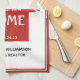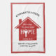 A stylish NEW HOME kitchen towel, designed as a realtor-to-client closing gift. ALL TEXT IS FULLY CUSTOMIZABLE so you can personalize the wording to suit your corporate branding. The text reads CONGRATULATIONS, BLESSINGS ON YOUR NEW HOME with Joshua 24:15 Bible verse - As for me and my house, we will serve the Lord. The image shows a RED house with white typography. The O of HOME is replaced with a key. At the bottom, you can add your name and company name, or personal message to your client (up to three lines recommended). Matching items available so you can create corporate gift sets for your clients. Other colours available.