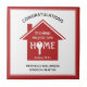 A stylish NEW HOME ceramic tile, designed as a realtor-to-client closing gift. ALL TEXT IS FULLY CUSTOMIZABLE so you can personalize the wording to suit your corporate branding. The text reads CONGRATULATIONS, BLESSINGS ON YOUR NEW HOME with Joshua 24:15 Bible verse - As for me and my house, we will serve the Lord. The image shows a RED house with white typography. The O of HOME is replaced with a key. At the bottom, you can add your name and company name, or personal message to your client (up to three lines recommended). Matching items available so you can create corporate gift sets for your clients. Other colours available.