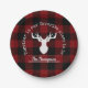 The product design features a silhouetted profile of a reindeer on a classic red and black buffalo plaid pattern. Combined with your own personalized text, this composition makes farmhouse country-style, modern, and unique paper plates for Thanksgiving, Christmas holiday, family reunion, or any other special gatherings!