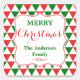 Modern red and green Christmas triangle patterned square sticker. The design features and alternating red and green triangle pattern, a white shape in the middle with the text "Merry Christmas", the family name and the year.