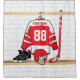 A unique and fun sports design with a personalized ice hockey jersey hanging in a locker room with a helmet, ice skates and a hockey stick. The jersey can be fully personalized with the number and name of your choice to make a great gift for any ice hockey fan, ice hockey coach or ice hockey player.