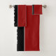 Stylish Red Bath Towel Set with two thin white stripes and a wide vertical Black stripe on the centre with custom name on it.